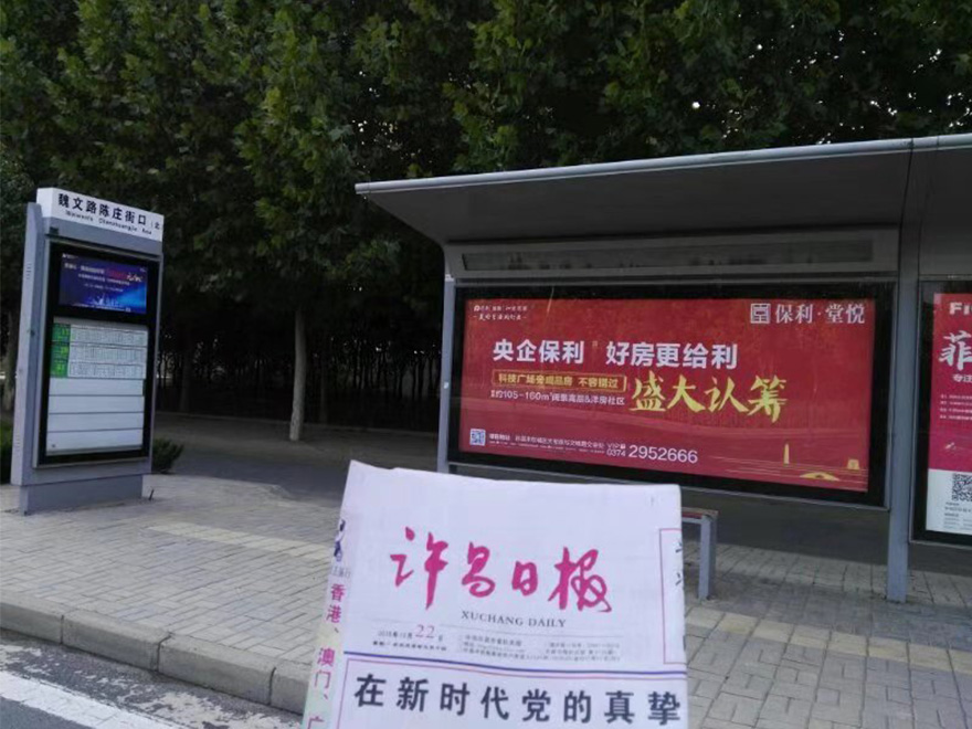 公司站亭规模迅速扩大,目前已 在全市运营公交站亭500余座,可以投放的广告位达到 1300余块。是许昌市规模最大,覆盖最广的户外媒体。其 中东区主干道:莲城大道、魏文路、学院路、魏武大道、 建安大道等;西区主干道:延安路、五一路、许继大道、 光明路等;南区主干道:新兴路、 文兴路等;北区主干道:文峰路、 以及中心城区:七一路、建设路、许由路、瑞贝卡大道、 天宝路、北关大街等; 南关大街、颍昌大道、建设路。