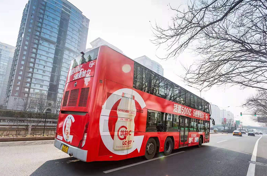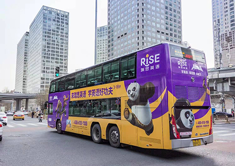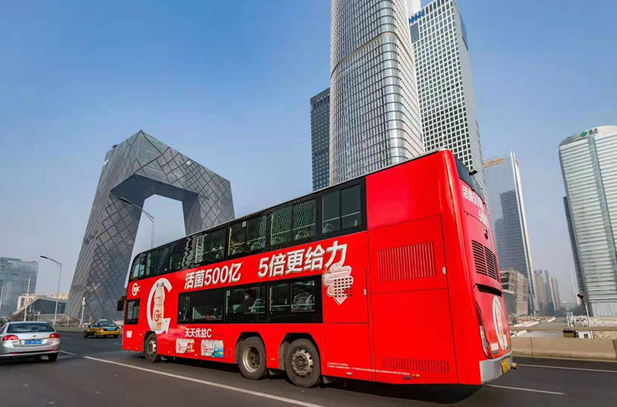 北京双层巴士共有49条线路,900多台双层巴士车身广告是在双层巴士车身张贴条幅的广告形式,一般在车辆左右两侧和车辆尾部张贴全彩画面。